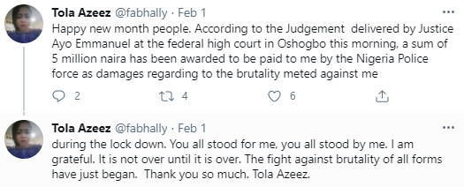”Happy new month people. According to the Judgement delivered by Justice Ayo Emmanuel at the federal high court in Oshogbo this morning, a sum of 5 million naira has been awarded to be paid to me by the Nigeria Police force as damages regarding to the brutality meted against me