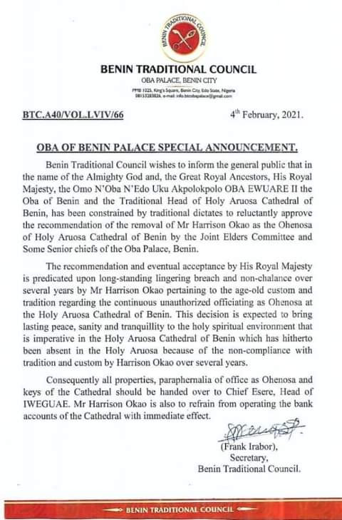 The statement said the removal of the priest of the church is “predicated upon long-standing lingering breach and nonchalance over several years by Mr Harrison Okao pertaining to the age-old custom and tradition regarding the continuous unauthorized officiating as Ohenosa of the Holy Aruosa Church of Benin,”