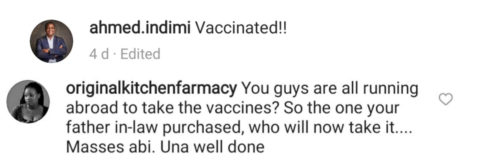 ”You guys are all running abroad to take thevaccines? So the one your father in-law purchased, who will now take it….Masses abi Una well done”