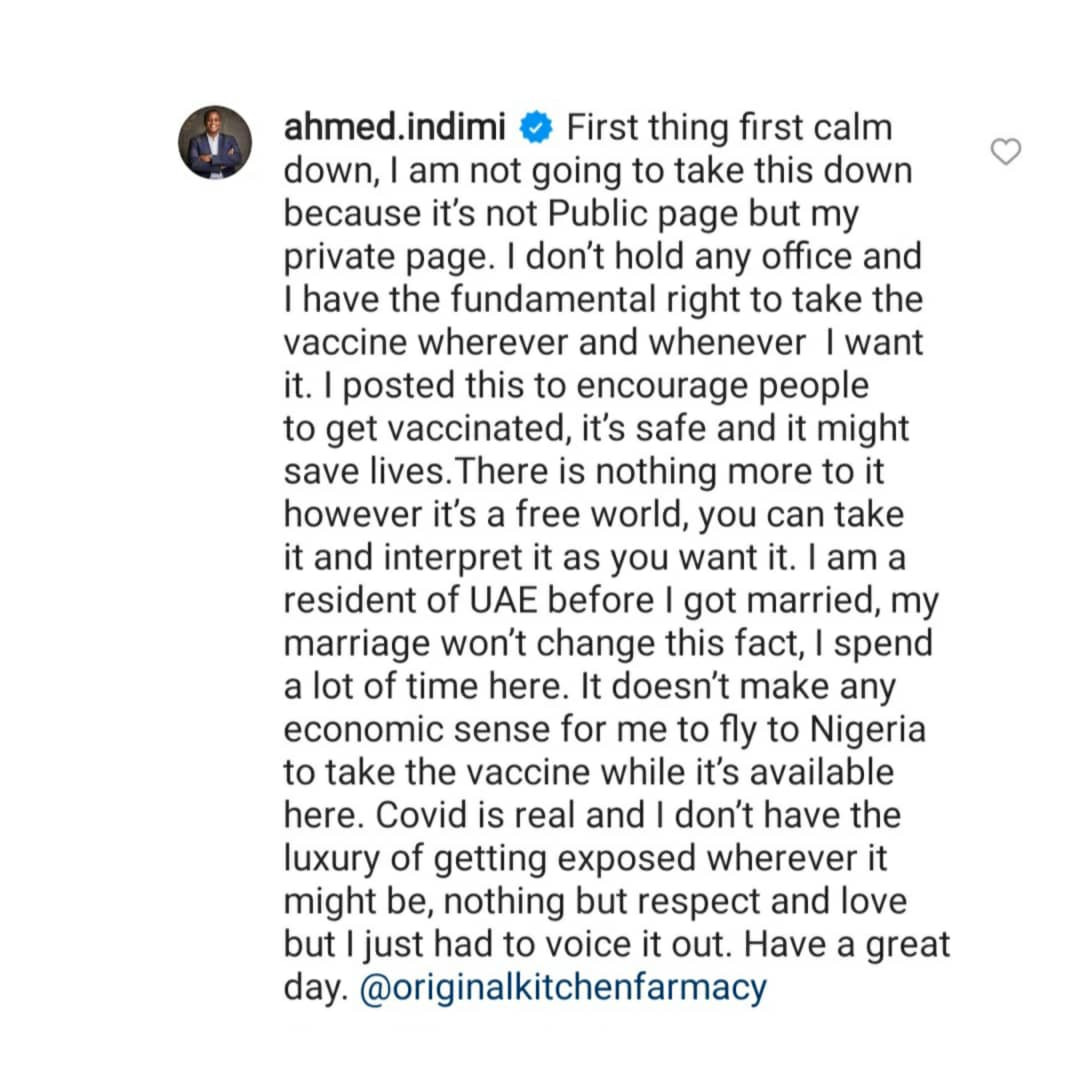 Ahmed saw the comment and responded stating that he resides in the UAE and sees no reason he should travel to Nigeria to come and take the vaccine when he can get it there. According to Ahmed, he is not a public office holder and has the right to take the vaccine where he so wishes.