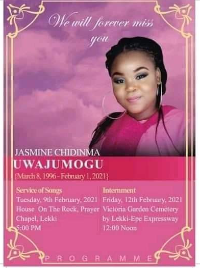 Jasmine, 24, died on February 1, 2021 and was laid to rest on Friday, February 12 at Victoria Garden Cemetary, Lekki-Epe Expressway, Lagos.