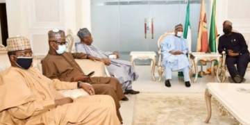 The visiting governors were Abubakar Bagudu of Kebbi State, Abdullahi Ganduje of Kano State, Abubakar Bello of Niger State, and Bello Matawalle of Zamfara State.