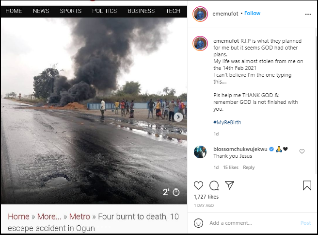 Emem Ufot who disclosed on Tuesday in an Instagram post that he was one of the 10 persons who escaped being burnt to death in the accident, he wrote;