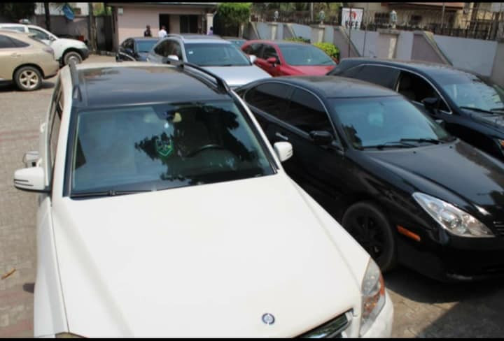 In a press release, the agency said they recovered 7 luxurious cars which include, one green Lexus ES350, one blue Lexus ES320, two Toyota Venza, one silver Lexus RX 350, one black Toyota, and one white Mercedes Benz 4Matic from some of the suspects.