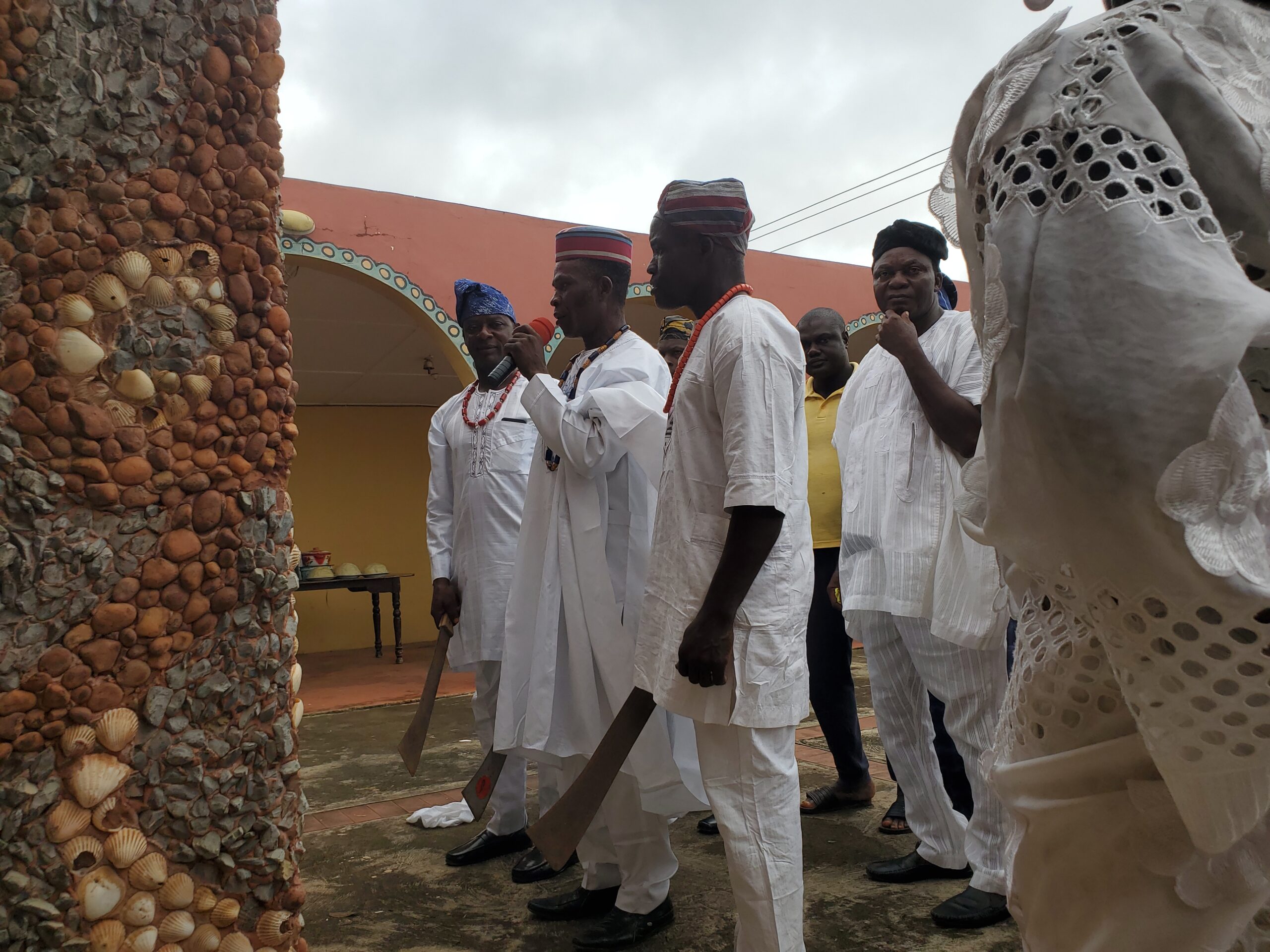 The male group did not assist the situation either, and this reporter was still in awe of the women’s displays of adoration. Along with other males, three men, who were probably in their mid-forties, emerged carrying cutlasses. The male group’s leader reached out his cutlass to the king, who touched it. After striking with their cutlass, the three men alongside others began praising and praying to the monarch.