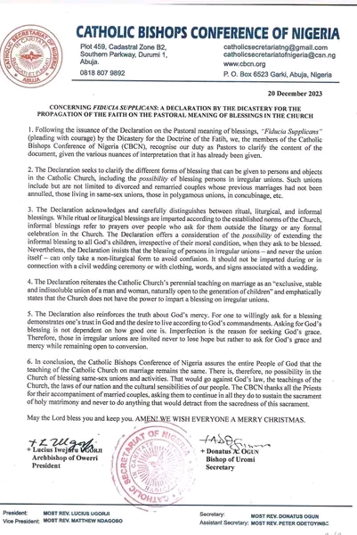 The statement which was signed the CBCN’s President, Most Rev. Dr. Lucius Iwejuru Ugorji, the Archbishop of Owerri  Diocese and its Secretary, Most Rev. Dr. Donatus Ogun, the Bishop of Uromi Diocese partly read thus; “the declaration acknowledges and carefully distinguishes between ritual, liturgical, and informal blessings. While ritual or liturgical blessings are imparted according to the established norms of the Church, informal blessings refer to prayers over people who ask for them outside the liturgy or any formal celebration in the Church.