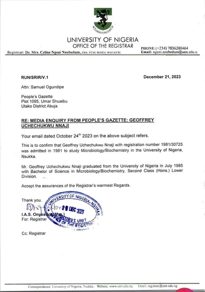 The letter partly read this; “From every available records and information from the University of Nigeria, Nsukka, we are unable to confirm that Mr Geoffrey Uchechukwu Nnaji, the current Minister of Science and Technology, graduated from the University of Nigeria in July 1985, as there are no records of his completion of study in the University of Nigeria, Nsukka.