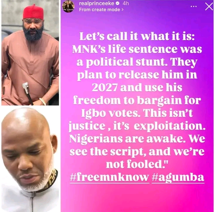Sometimes the loudest tremors don’t come from protests or headlines. They start in small places, a phone buzzing, a post on Instagram, a celebrity speaking truths most people whisper. That’s what happened when Prince Eke dropped his statement about Nnamdi Kanu. He didn’t dance around it. He didn’t phrase it in political jargon. He said straight up, they plan to release Kanu and use his freedom to win Igbo votes in 2027. And just like that, the streets, social media, WhatsApp groups, cafés, and markets started vibrating.