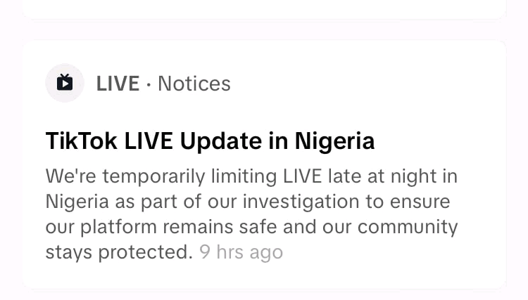 The only official word came from the in app notification. The message said TikTok was temporarily limiting late night LIVE in Nigeria as part of a safety investigation. No date, no deadline, no extra detail, just that line. And Nigerians know what that kind of corporate language means. It means something bigger is happening behind the scenes.