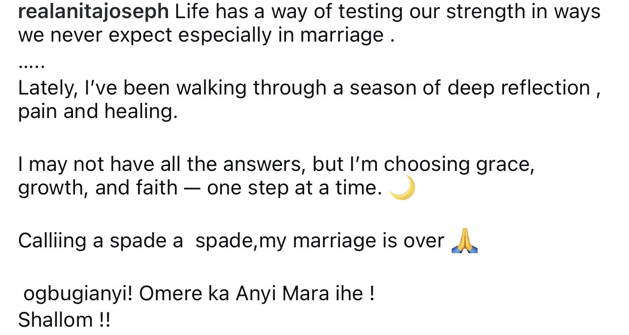 In December 2025, Anita Joseph confirmed what had lingered for months as speculation: her marriage was over. The announcement did not come with scandalous details or finger-pointing. Instead, it arrived as a reflective confession. She simply wrote on Instagram: