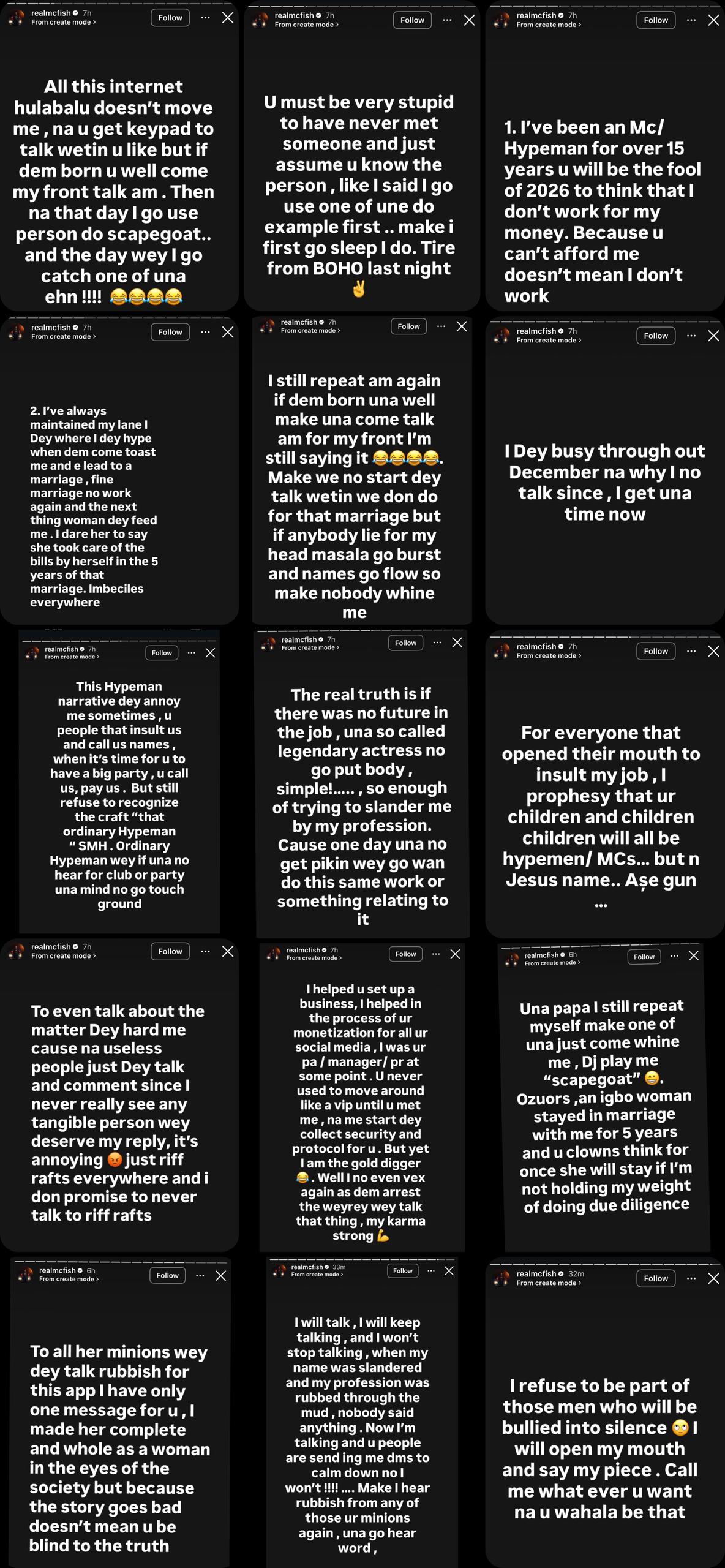 On January 3, 2026, with the new year barely a few days old, MC Fish took to Instagram to defend himself and respond to circulating narratives about the split. His posts were equal parts defensive, emotional, and combative and they quickly became a trending topic on social media.