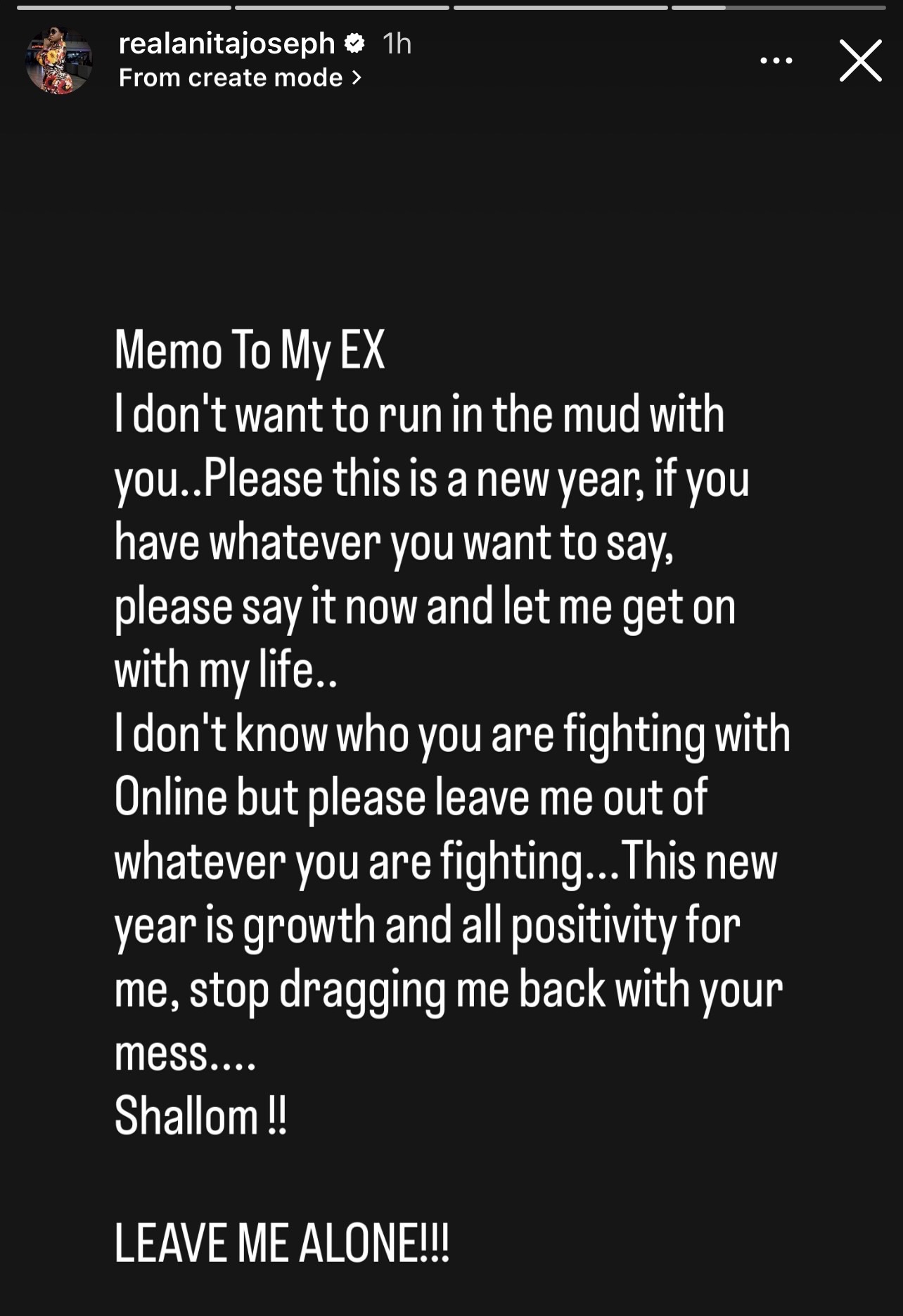 Hours after MC Fish’s barrage of posts and just before what would have been Anita’s 41st birthday celebrations on January 4, she posted her own message. In contrast to his detailed rebuttals and emotional vindication, Anita took a more restrained but assertive stance. In an Instagram story she wrote: