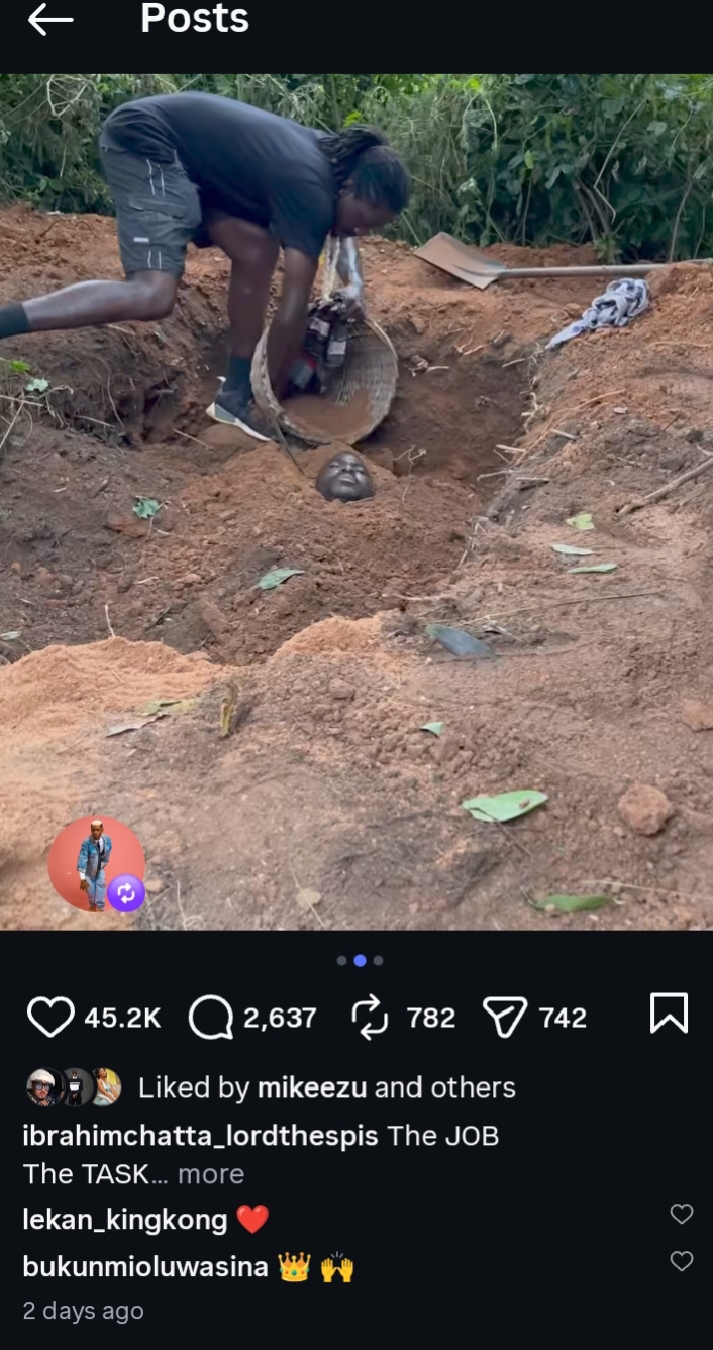 The image did not arrive with context, it rarely does in the age of endless scrolling. A man’s head emerging from red earth, his shoulders gone, his body surrendered to soil, eyes open, expression unreadable. For a few seconds, the image asked a dangerous question without speaking it aloud. What does it mean when a respected Nollywood actor appears buried alive, not in a movie frame but behind the scenes, not under studio lighting but raw daylight?.