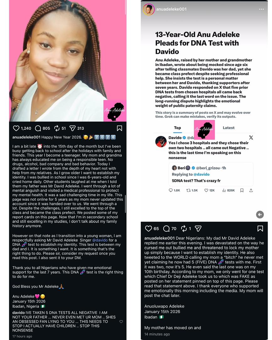On January 15, 2026, Anu Adeleke posted a heartfelt message on social media, marking the beginning of a renewed wave of attention to the long-running paternity dispute between her and Davido. In the post, Anu introduced herself as she transitions into her teenage years and explained that she wanted to establish her identity by requesting a DNA test from Davido.