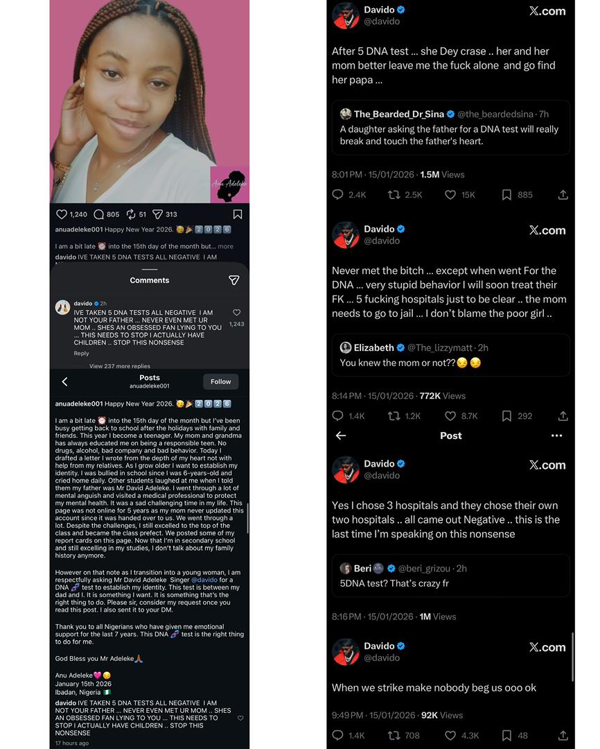 Recently, when Nigerian music superstar Davido trends, it is usually for a hit song, a sold-out concert, or a major career milestone. On January 15, 2026, however, his name returned to the centre of public conversation for a very different reason. It centred on a renewed paternity controversy involving a teenage girl known as Anu Adeleke.