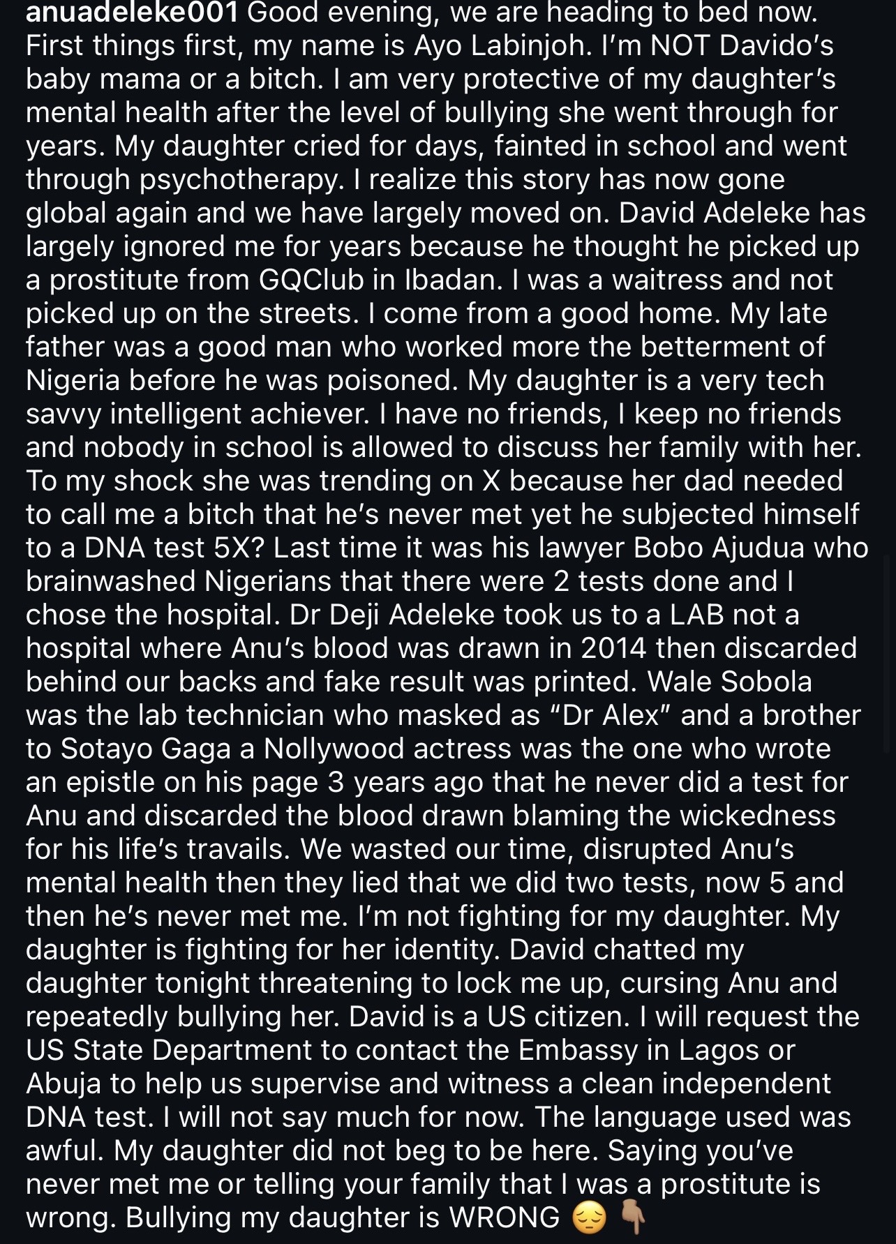 In the post, Anu claimed that Davido responded harshly to her privately and publicly, saying she felt bullied and threatened simply for seeking to establish her identity. She also accused him of publicly insulting her mother and disputed his claim that multiple DNA tests had been conducted.