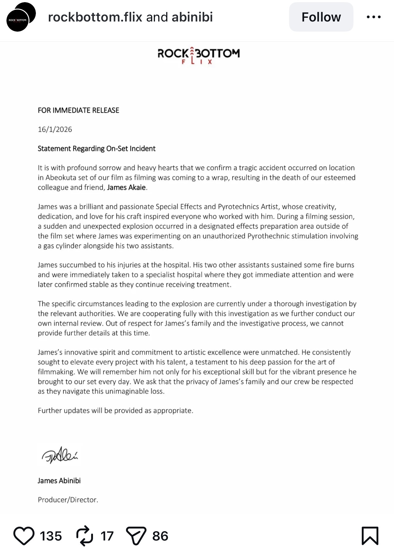 On January 16, 2026, filmmaker, James Abinibi announced James Akaie was involved in a tragic accident on the set of the upcoming movie, One Gidi Night, in Abeokuta, Ogun State. The incident occurred while preparations were being made for a special effects sequence. The statement released read in part: