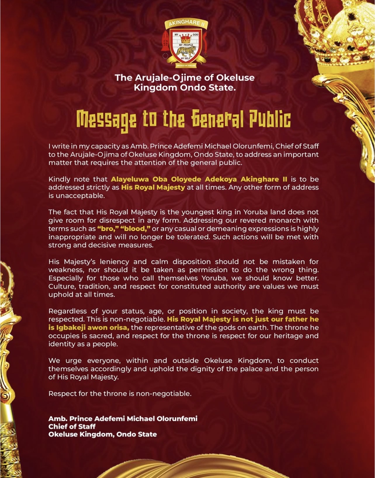 The palace added that his youth should not be used as an excuse for informality. “The fact that His Royal Majesty is the youngest king in Yoruba land does not give room for disrespect in any form,” the statement emphasised. It warned that casual expressions would no longer be tolerated and could be met with decisive action. See statement below: