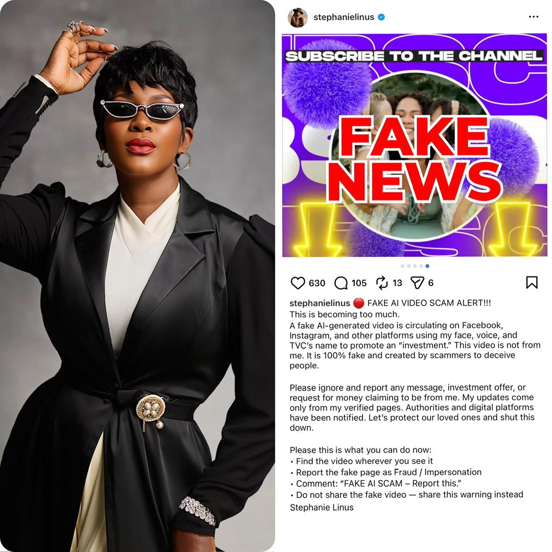 On January 23, 2026, Stephanie Linus, a respected Nollywood filmmaker and advocate, took to Instagram to warn her followers about a fake video created using artificial intelligence that was circulating online. According to her post, the video used her face and voice, as well as the name of a media organization, to promote a fraudulent investment scheme. Linus wrote in capital letters, “FAKE AI VIDEO SCAM ALERT!!! This is becoming too much. … This video is not from me. It is 100% fake and created by scammers to deceive people.”
