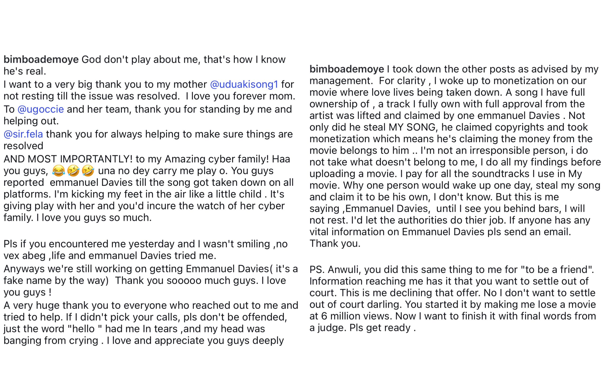 In another message, Bimbo named the alleged claimant as Emmanuel Davies, also known as “Lagos Sound,” and issued a dramatic ultimatum. She gave him one hour to lift the claim or face consequences. “YOU HAVE 1 HOUR…Before I handle this MY OWN WAY!” she warned.