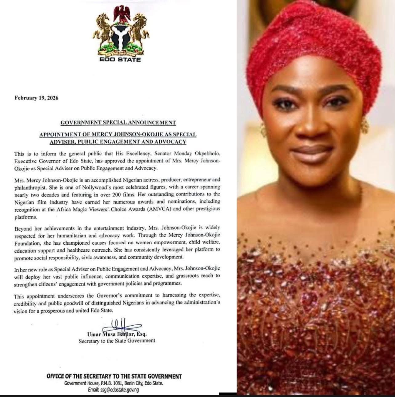 When news broke that Nollywood star Mercy Johnson-Okojie had been appointed Special Adviser on Public Engagement and Advocacy by the Edo State Government, reactions came fast and loud. For some, it was a surprising leap from movie sets to the corridors of power. For others, it was a strategic move that highlights a growing trend of merging celebrity influence with governance.