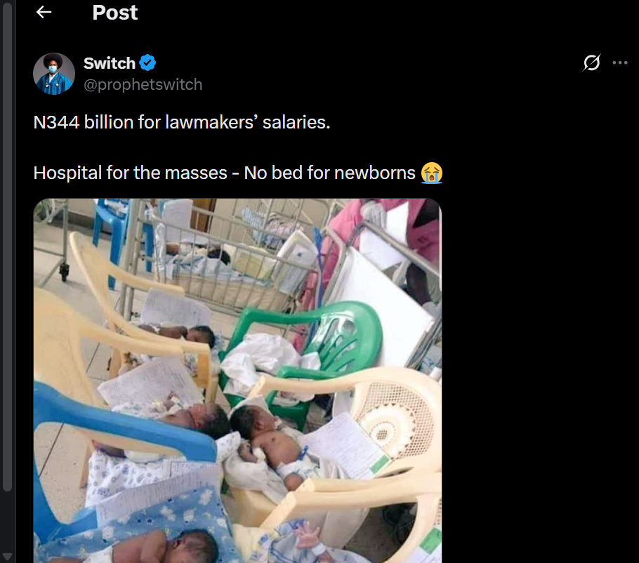 Claim: An image that has gone viral on X is suggested to be from Nigeria. The image shows babies placed on plastic chairs in what looks like a hospital. The images posted by X user, @prophetswitch, followed a caption that read, “ N344 billion for lawmakers’ salaries. Hospital for the masses – No bed for newborns”
