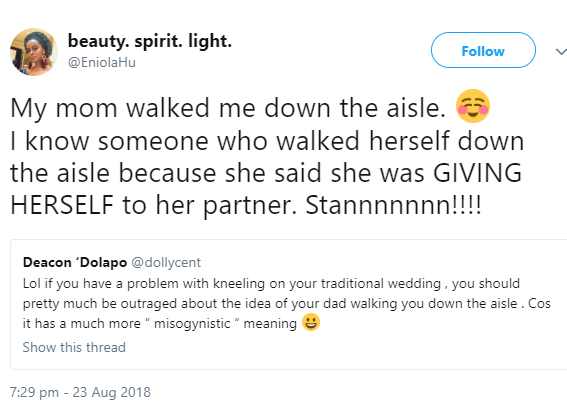 And the new bride replied: “My mom walked me down the aisle. ?? I know someone who walked herself down the aisle because she said she was GIVING HERSELF to her partner. Stannnnnnn!!!!”