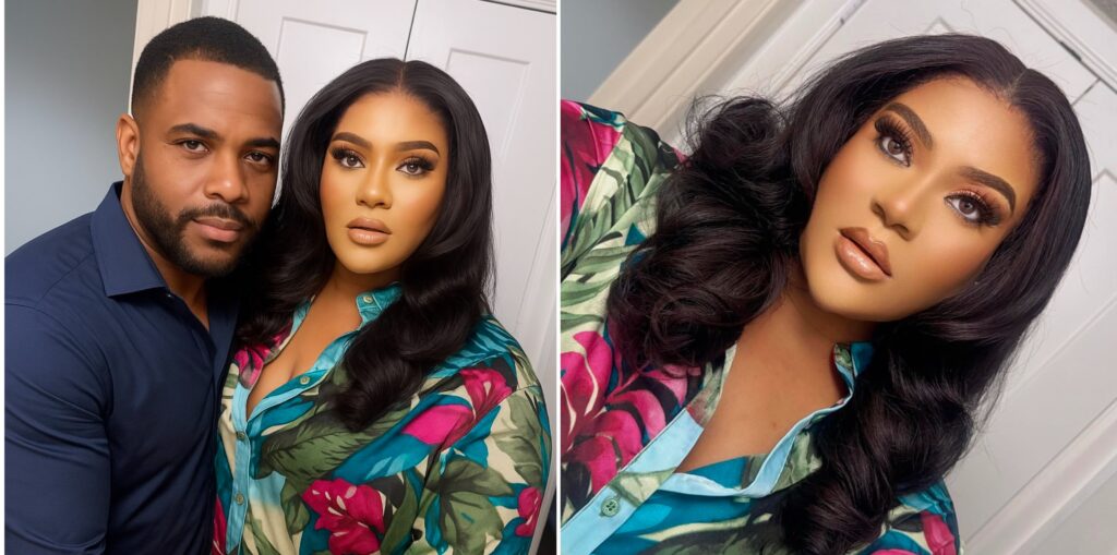 Dressed in a bold floral outfit with face beat to perfection, Nkechi posed beside her handsome boo, whose beard game is just as strong as his hold on her waist.