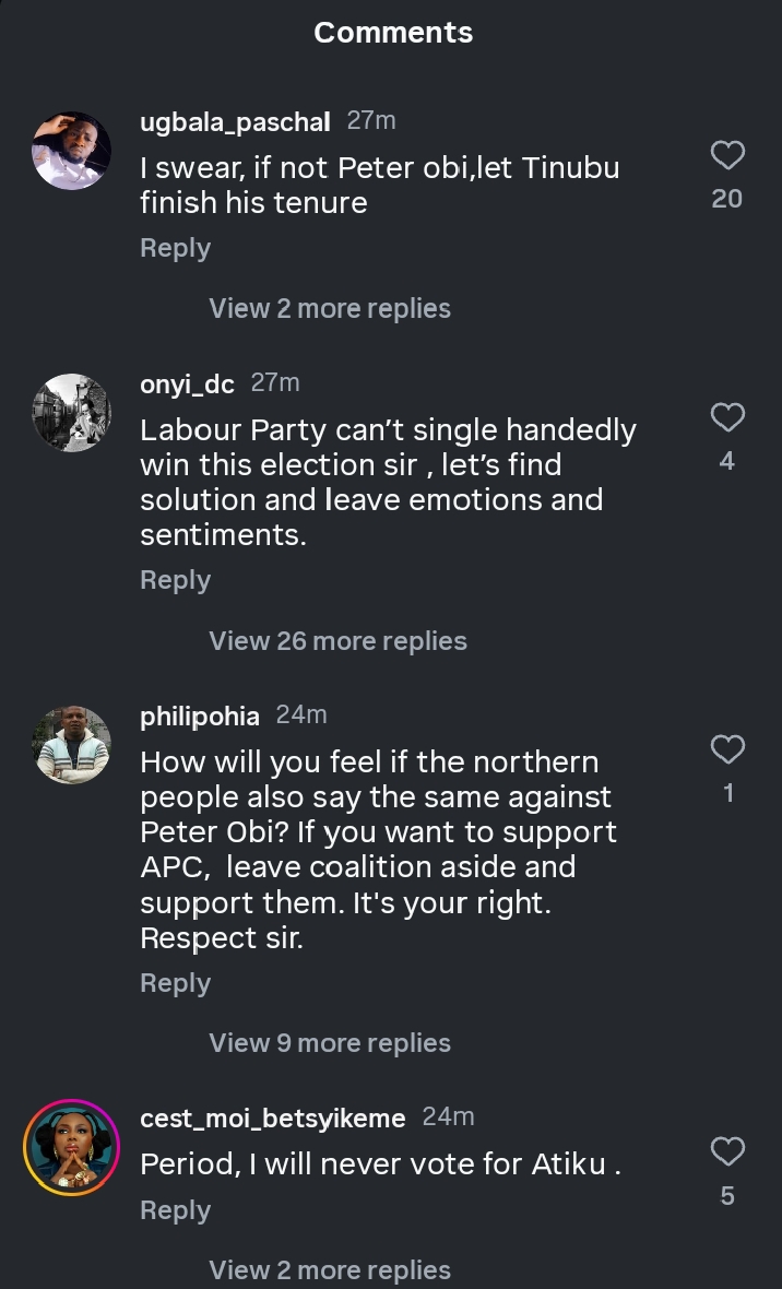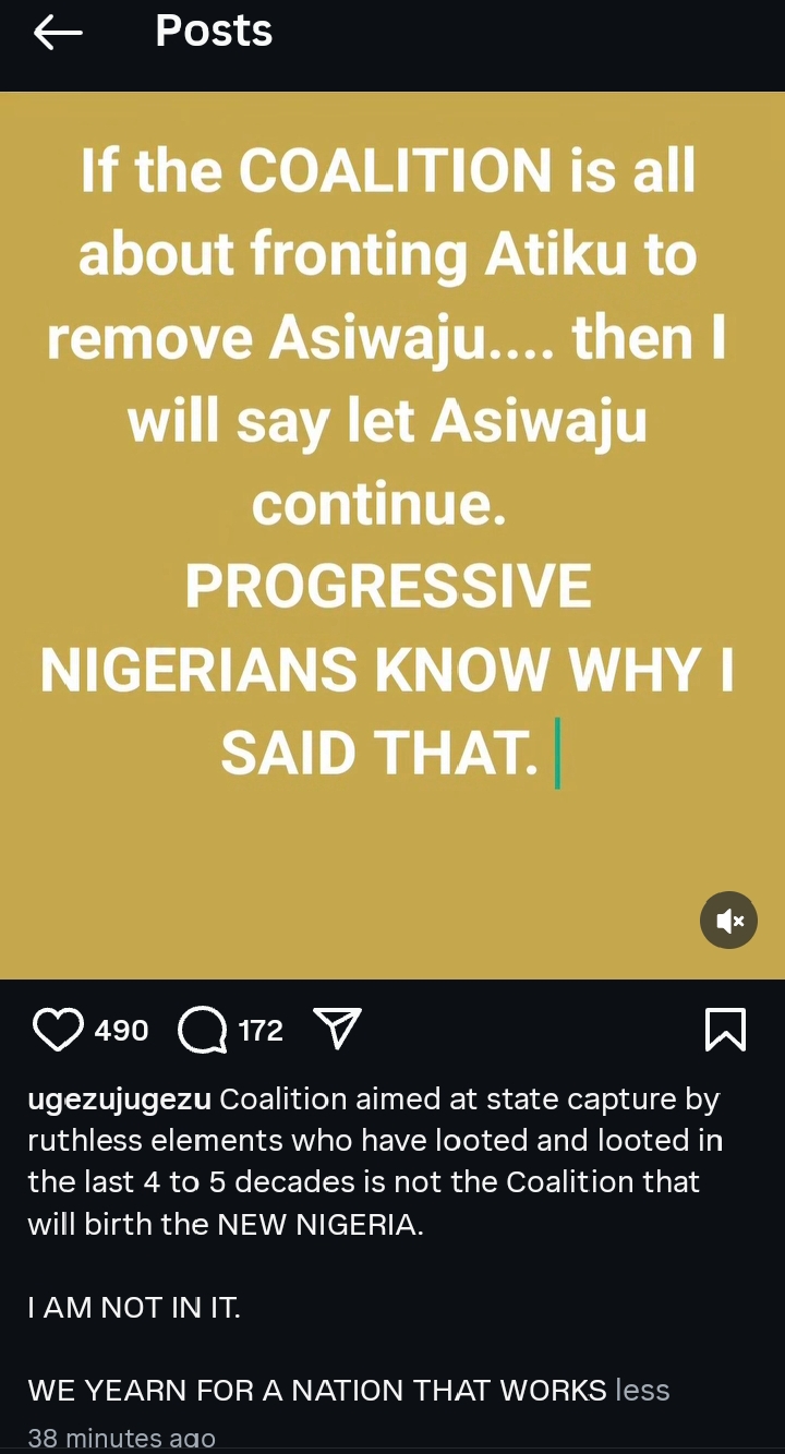 Ugezu’s position mirrors the sentiments of many grassroots Obi-dients, who flooded social media with sharp criticism of any alliance that sidelines Peter Obi or recycles familiar political faces.