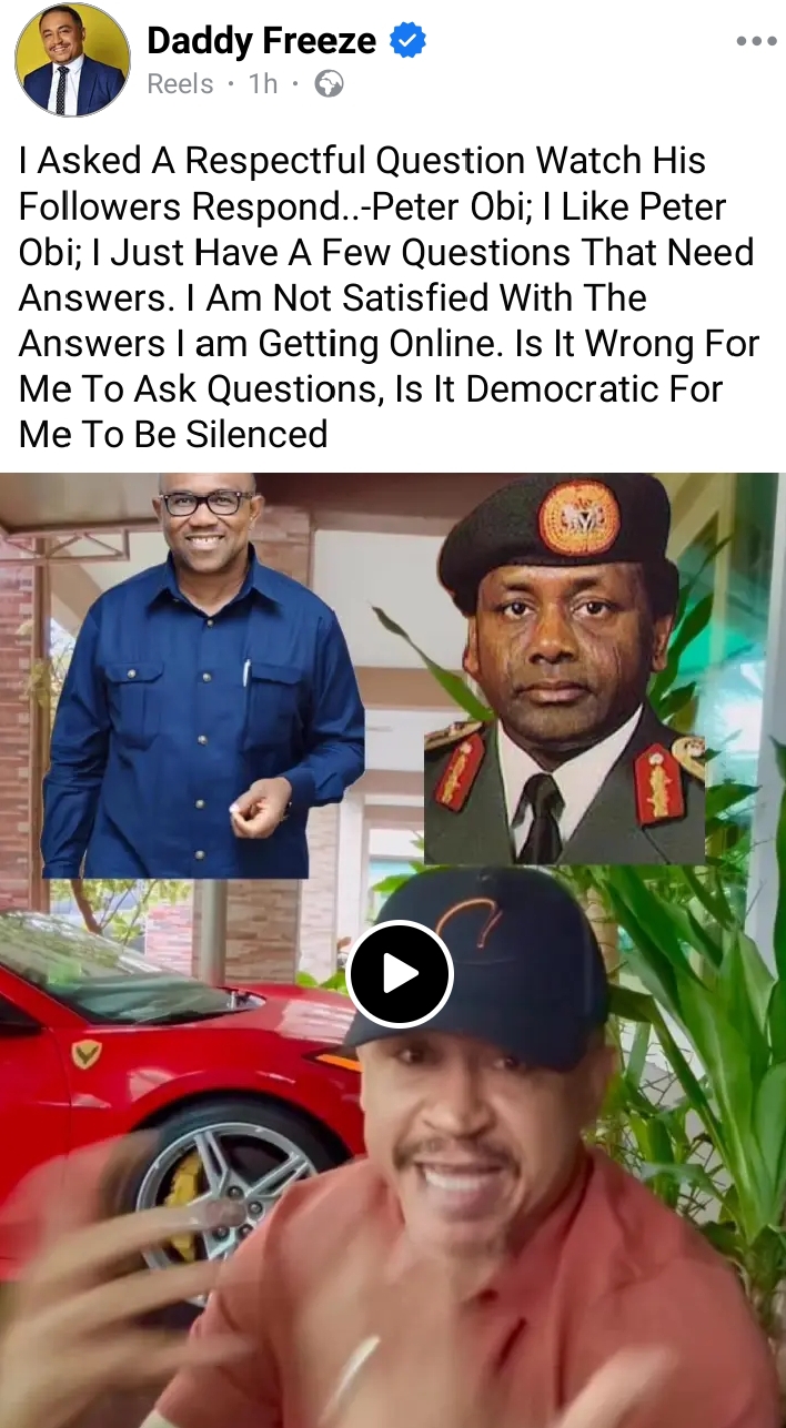 The question referenced a resurfaced video where Obi appeared to speak about his involvement during the Abacha era, prompting Freeze to express doubt about the transparency of Obi’s political record.