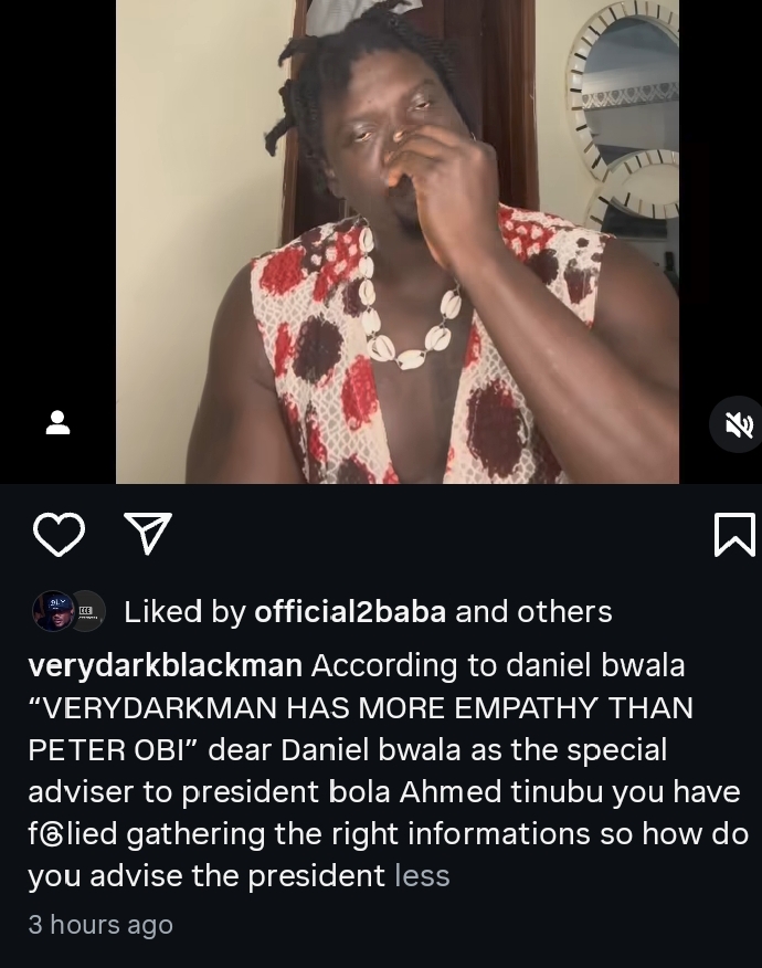 In a recent video shared on his Instagram page, Verydarkman responded to a growing political debate sparked by Daniel Bwala, special adviser to President Bola Tinubu on policy communication, who controversially compared him to Peter Obi regarding public empathy over the recent Benue massacre.