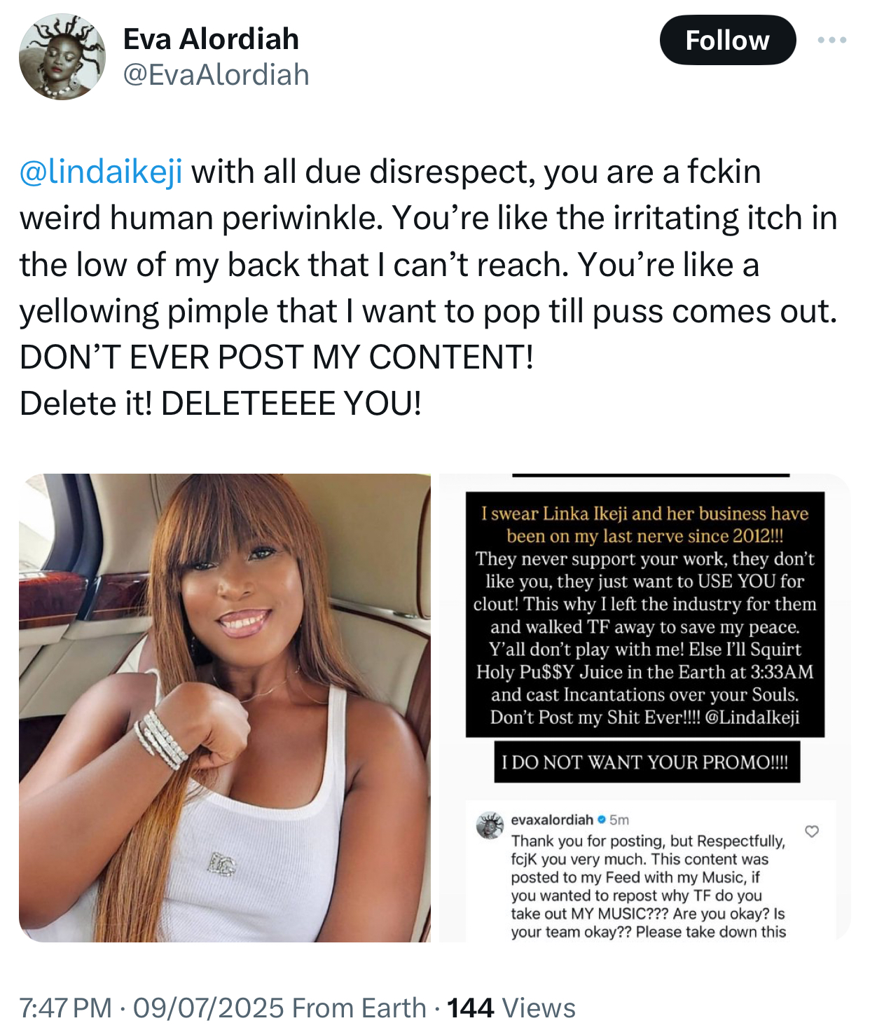 “Linda Ikeji, I’m not the woman you want to play with — not in this timeline. DELETE MY CONTENT FROM YOUR FEED! DELETE YOURSELF!!!!!!!”