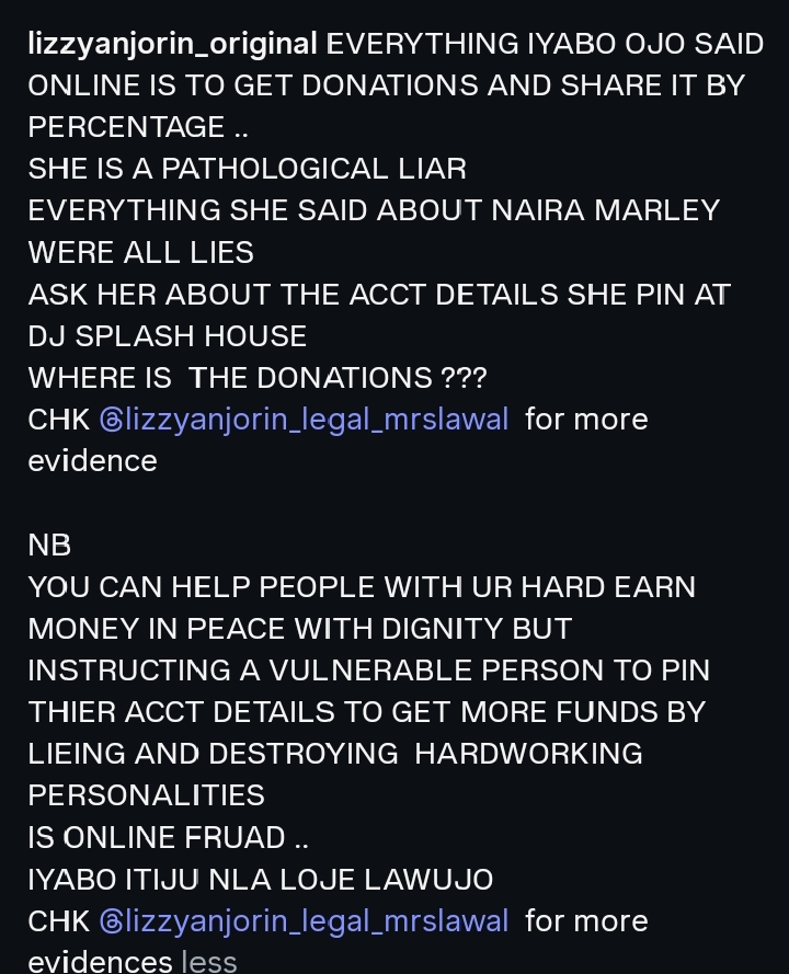 She urged her followers to visit her alternate Instagram page, @lizzyanjorin_legal_mrslawal, for what she described as “evidence” to back up her claims against Iyabo Ojo.