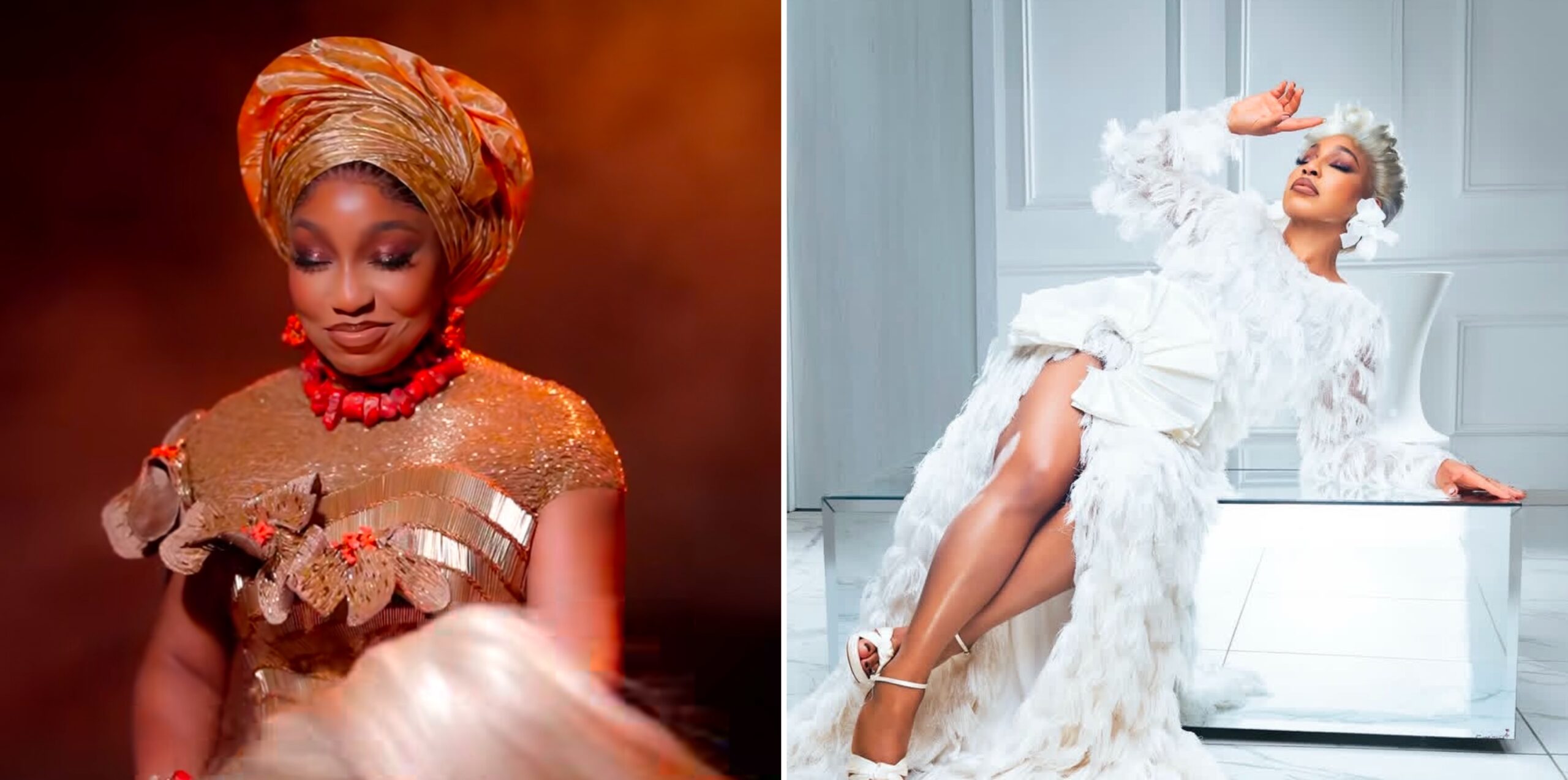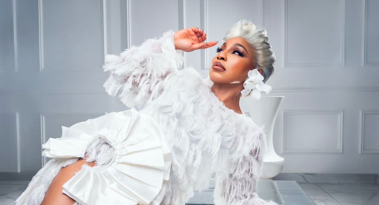In one striking photo, Rita Dominic channels celestial energy in a white feathered couture gown complete with long, textured sleeves, a dramatic thigh-high slit, and an oversized bow at the waist. She finishes the look with white platform heels and a short platinum-blonde pixie cut that frames her face like a halo.
