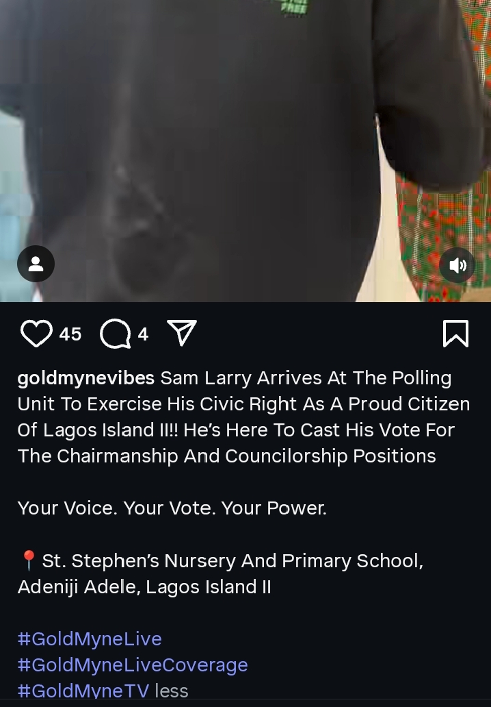 Sam Larry’s arrival at the polling venue was captured in a video shared by Goldmyne TV, which showed the entertainment figure stepping out of a vehicle with members of his entourage.