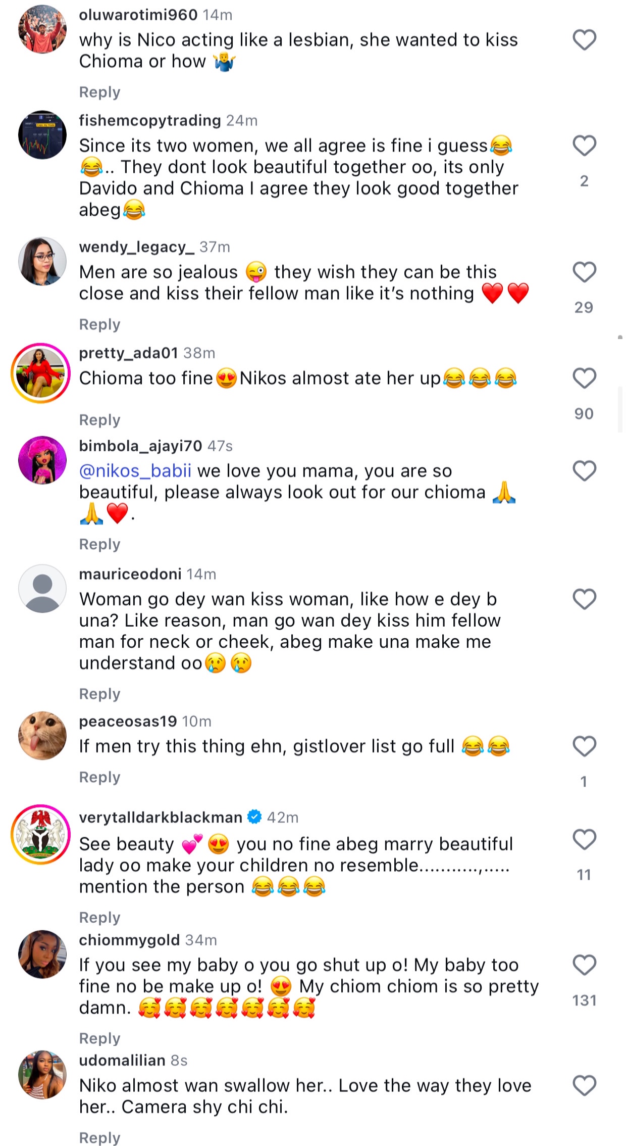 One user, @oluwarotimi960, sparked debate with the comment: “Why is Nico acting like a lesbian, she wanted to kiss Chioma or how?” — a sentiment echoed by @fishemcopytrading, who wrote: “Since it’s two women, we all agree it’s fine I guess… They don’t look beautiful together oo. It’s only Davido and Chioma I agree they look good together abeg.”