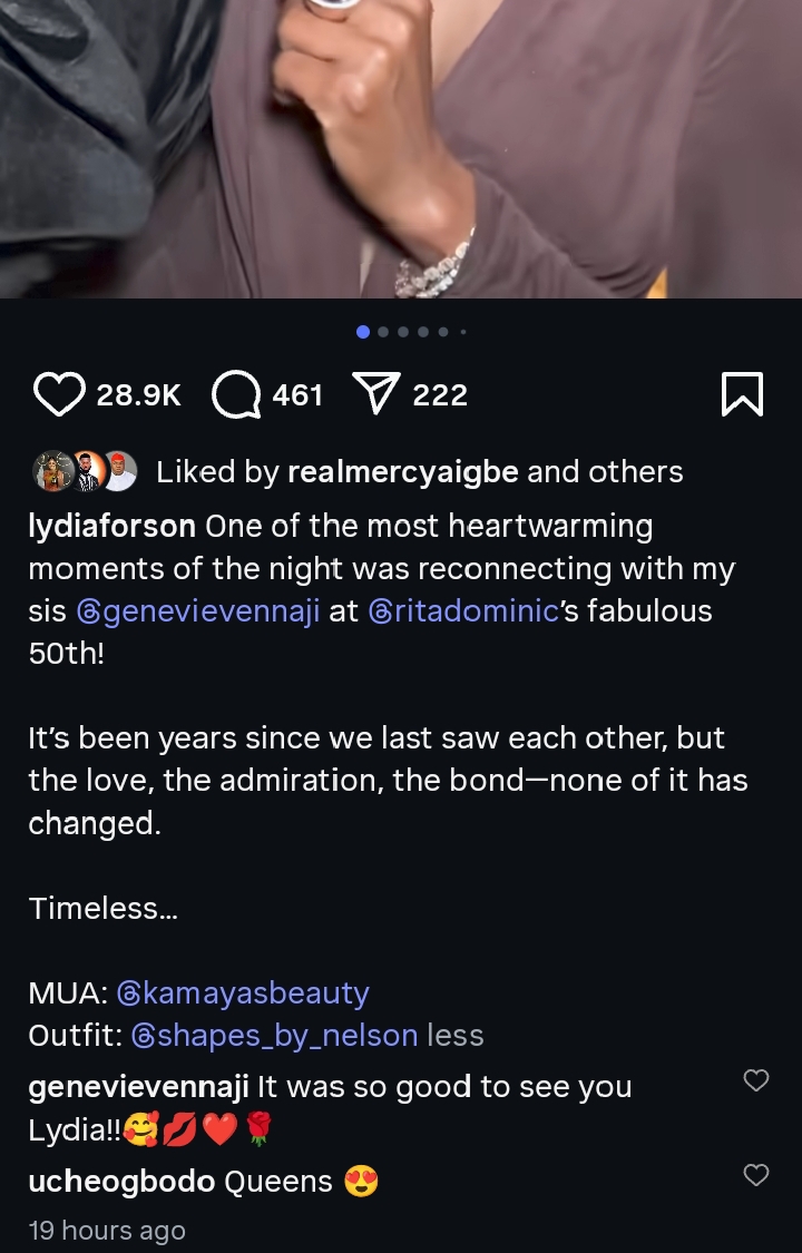 In a trending Instagram video shared by Ghanaian actress Lydia Forson, Genevieve is seen sharing a heartfelt moment with her old friend.