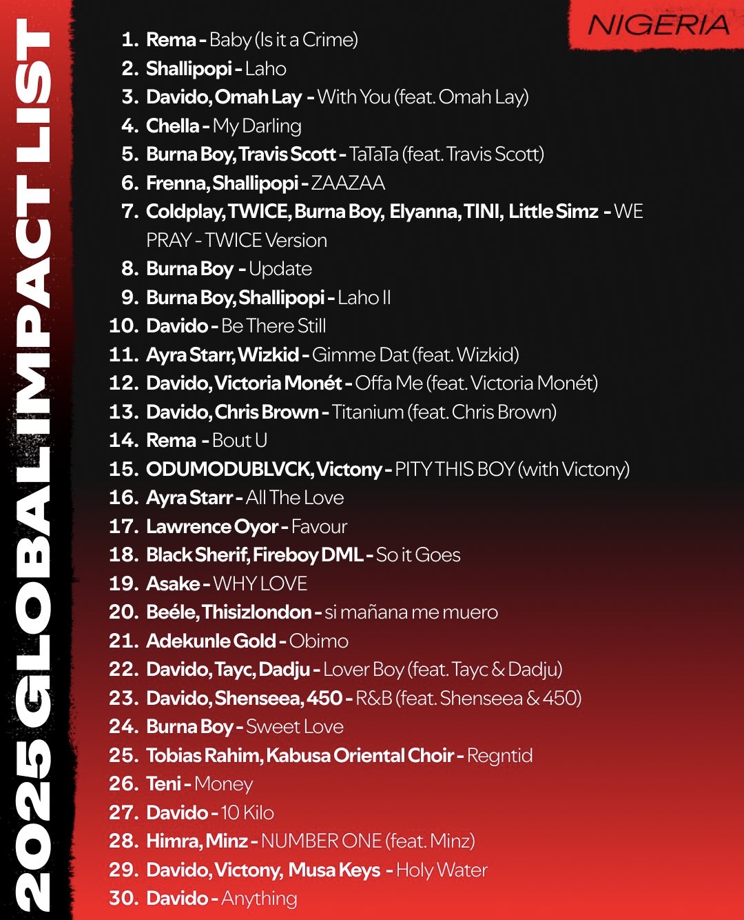 While Rema may have scored the biggest single, it’s Davido vs Burna Boy that fans are buzzing about. Davido outpaced Burna with 9 entries to Burna’s 5, sparking renewed debates online about whose pen and presence are truly ruling the global scene in 2025. See screenshot of full list of top 30 below: