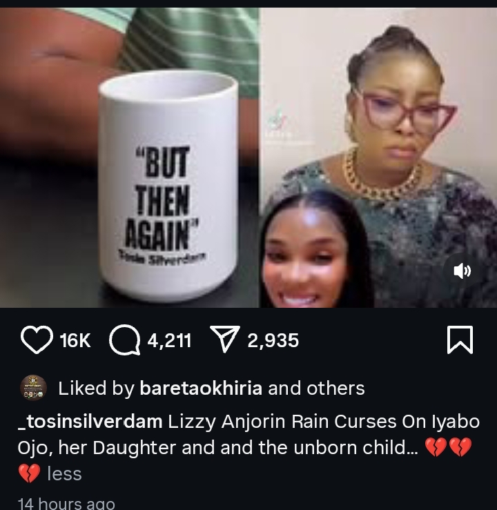 A viral video showing Nollywood actress Lizzy Anjorin raining curses and wishing death on fellow actress Iyabo Ojo, her daughter Priscilla, and her unborn child has triggered widespread condemnation on social media.
