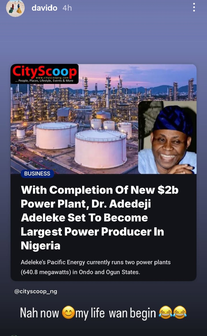 Afrobeats superstar David Adeleke aka Davido is visibly elated as his father, billionaire businessman Dr. Adedeji Adeleke, inches closer to becoming the single largest power producer in Nigeria.