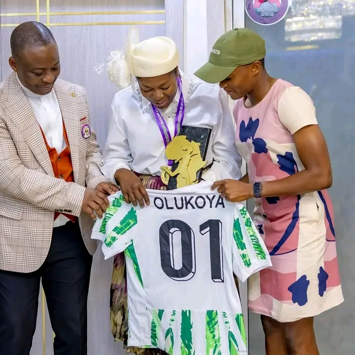 The decorated football star, who led Nigeria’s women’s national team to victory at the Women’s Africa Cup of Nations in Morocco, was captured in viral video and photos personally handing over her Woman of the Match trophy, WAFCON medal, and a custom jersey bearing the name “OLUKOYA 01” to the visionary pastor and his wife as a symbolic token of appreciation, after giving her testimony in church.