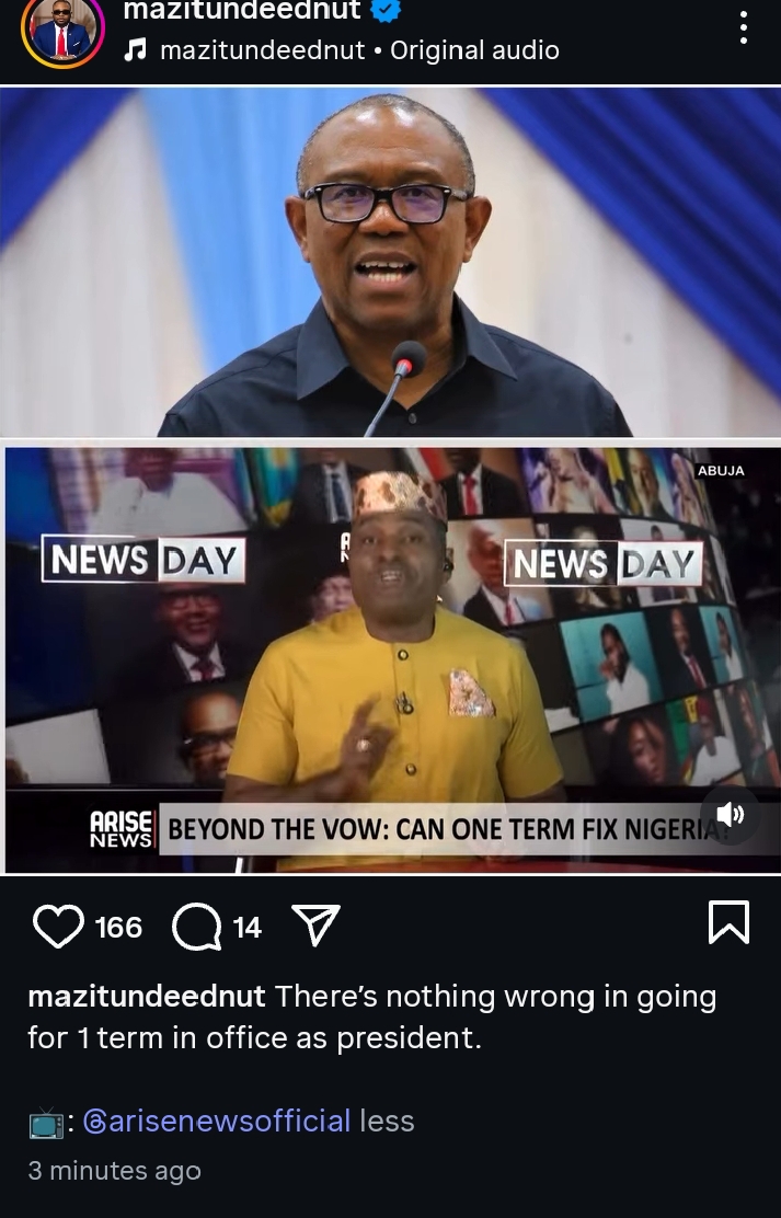 His remarks come in defense of Peter Obi’s renewed commitment to serve only one term if elected—an idea that continues to spark mixed reactions across the political landscape.