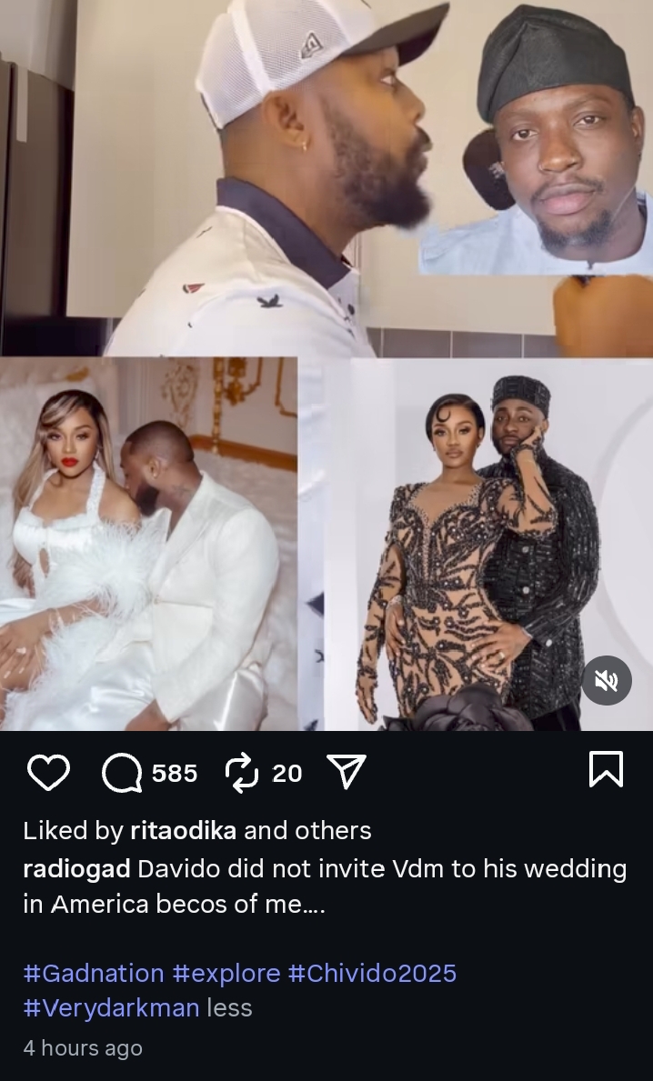 In a video making the rounds online, Radiogad alleged that Davido made the decision due to VeryDarkMan’s tendency to divert attention to himself. He recalled the influencer’s presence at the couple’s traditional wedding in Nigeria, where, according to him, VeryDarkMan shifted the post-event narrative in a controversial direction.