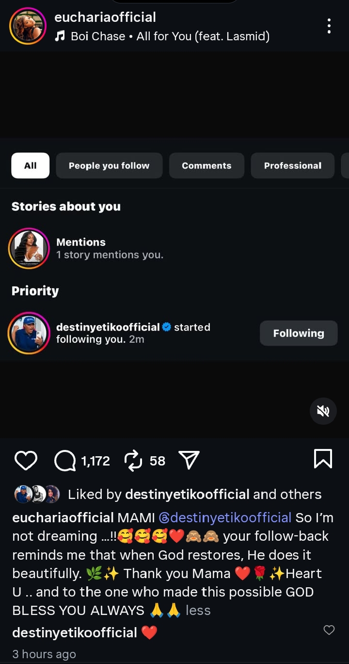 The recent social media gesture by Destiny Etiko signals a hopeful turn in their relationship, with Eucharia’s public message emphasizing forgiveness and restoration.