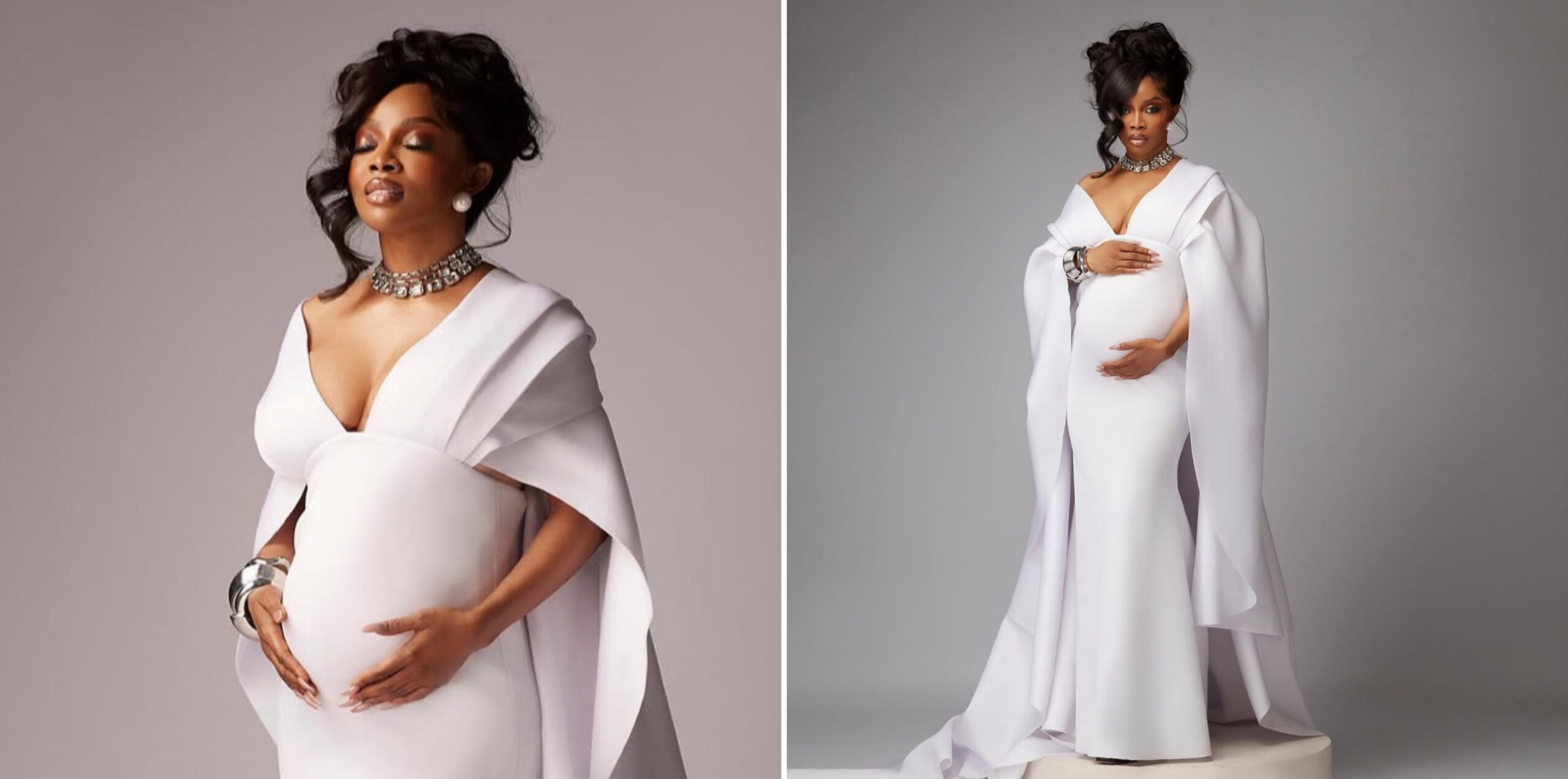 Toke Makinwa cradled her baby bump in all the shots, her hair styled in an elegant updo, paired with bold pearl earrings and a statement necklace, giving off a regal, ethereal vibe.