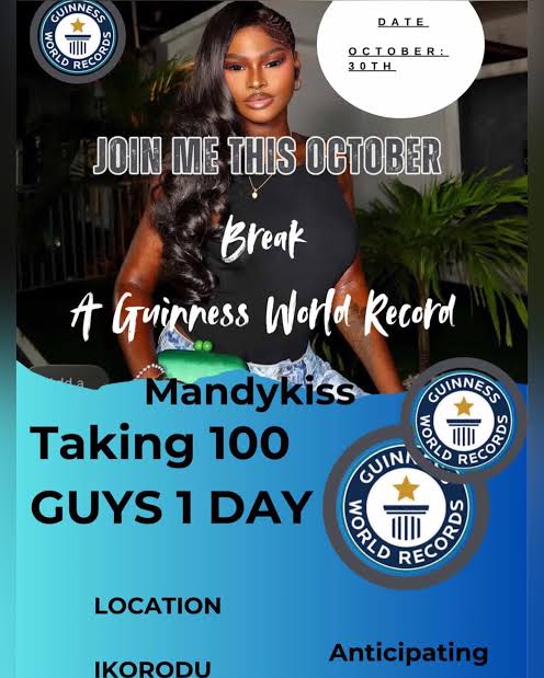 The turning point came on September 22, 2025, when Mandy announced on Instagram that she was planning a Guinness World Record attempt. Her proposed challenge was to “sleep with 100 men in 24 hours” in Ikorodu, Lagos. She even shared a digital flyer carrying the Guinness logo. The announcement spread across Nigeria within hours.