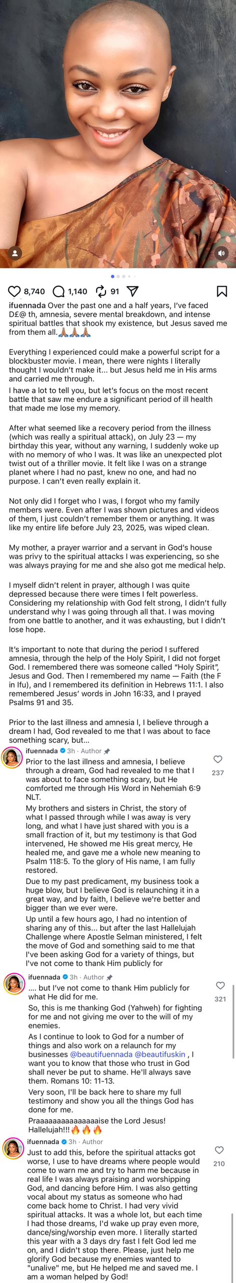 In the long post accompanied by screenshots of WhatsApp chats, Ifu revealed that for months she lived in confusion, unable to remember who she was or the people around her. She said there were days she woke up feeling completely disconnected from her identity and her past. Her words were heavy with emotion as she described it as a period when she “died and came back,” recalling how she could barely function and was constantly fighting unseen forces that left her physically weak and mentally drained.