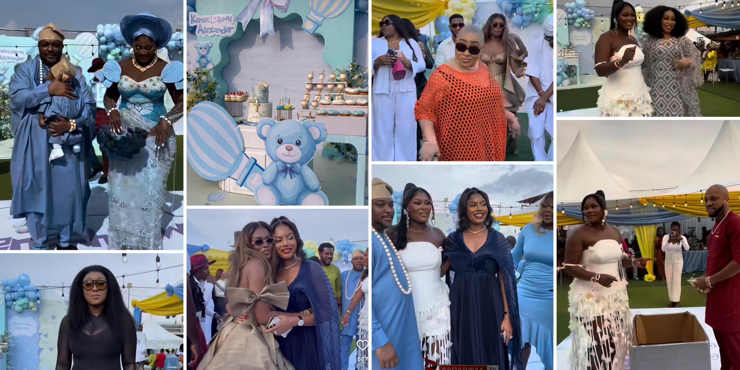 The baby dedication itself was everything fans hoped it would be. It wradiant, emotional and full of Nollywood’s familiar faces. Chizzy wore a blue gown and matching headgear before changing into a stunning white gown with intricate gold and silver detailing on the trimmings, while her husband complemented her look in a crisp blue traditional outfit. The celebrant matched his father’s outfit in his blue traditional agbada outfit, gold cap, and white sneaker. They all glowed with gratitude as they danced into the event, surrounded by friends, family and colleagues.