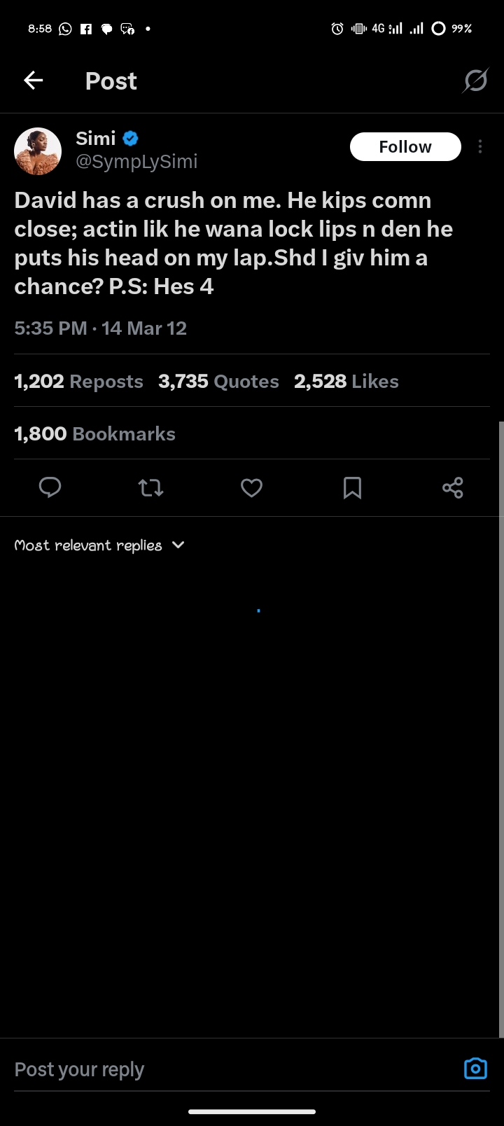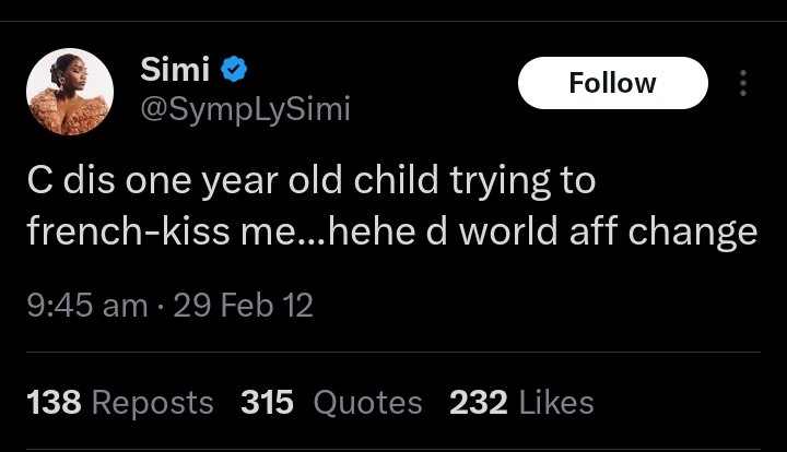 While some may argue that at the time Simi made those, Twitter was an arena of intemperate, unfiltered, unabashed and unrestrained chronicling of people’s unhinged, idiotic and despicable thoughts and she probably didn’t do or even meant any of the grotesque missives. This assertion may have been given consideration if Simi was a teenager at the time, but she wasn’t a carefree, unstable, wild but innocent teenager, she was already a young adult who could tell her right from her left and was fully aware that are distastefully perversive posts bordered on pedophilia and even when concerned minds warned her that her litany of sensual monologue about babies violated Nigerian child rights law, she was quite dismissive. There is a thin line between a freak and a pervert. Simi crossed that line by a mile.