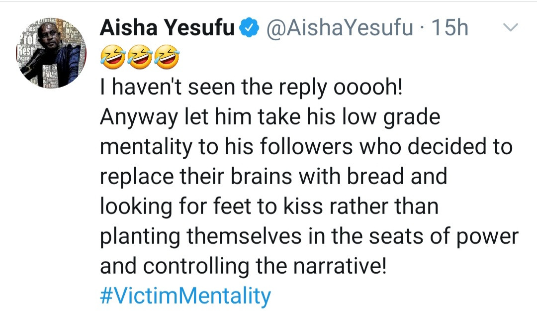 Anyway let him take his low grade mentality to his followers who decided to replace their brains with bread and looking for feet to kiss rather than planting themselves in the seats of power and controlling the narrative! #VictimMentality.”